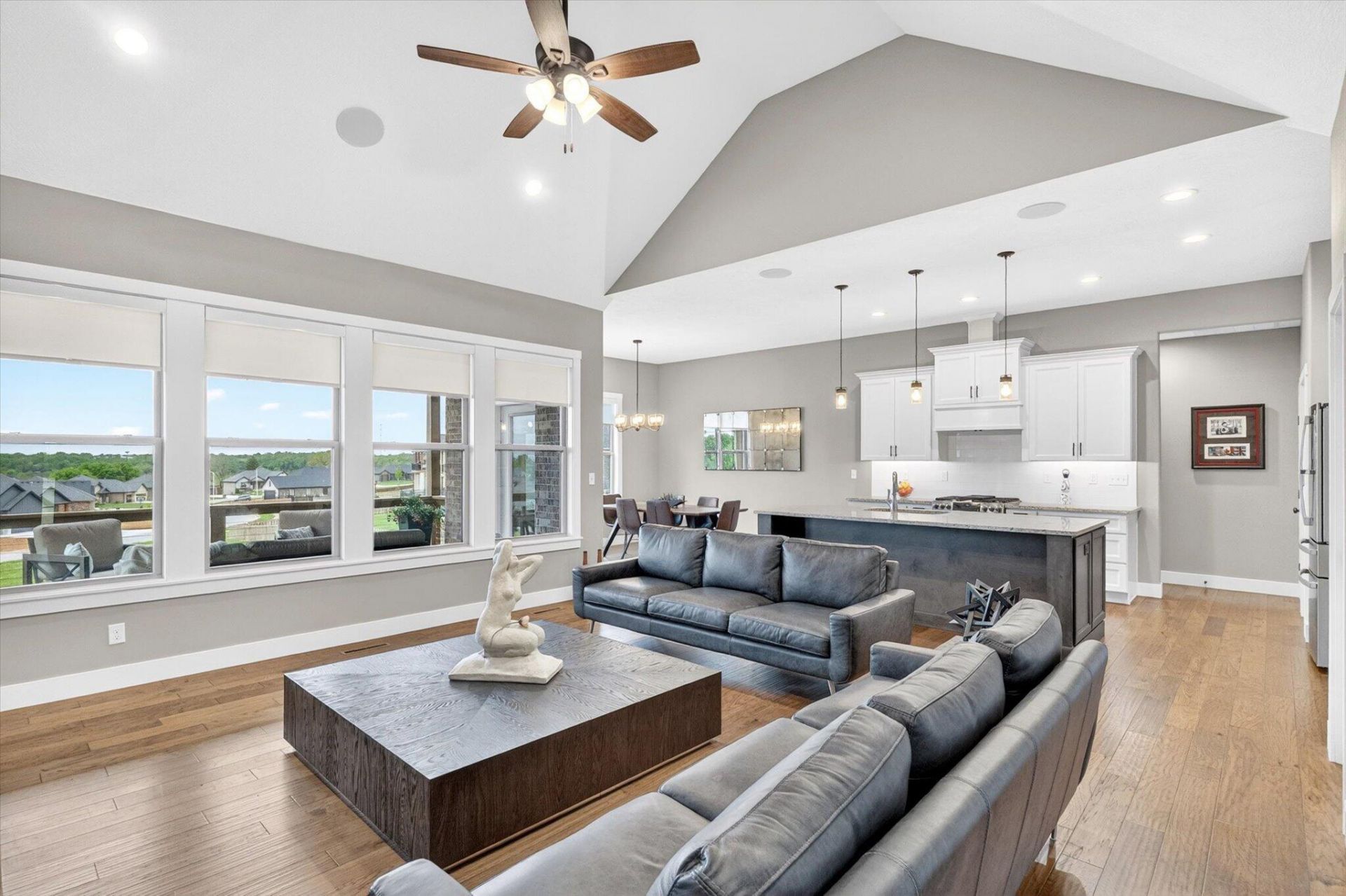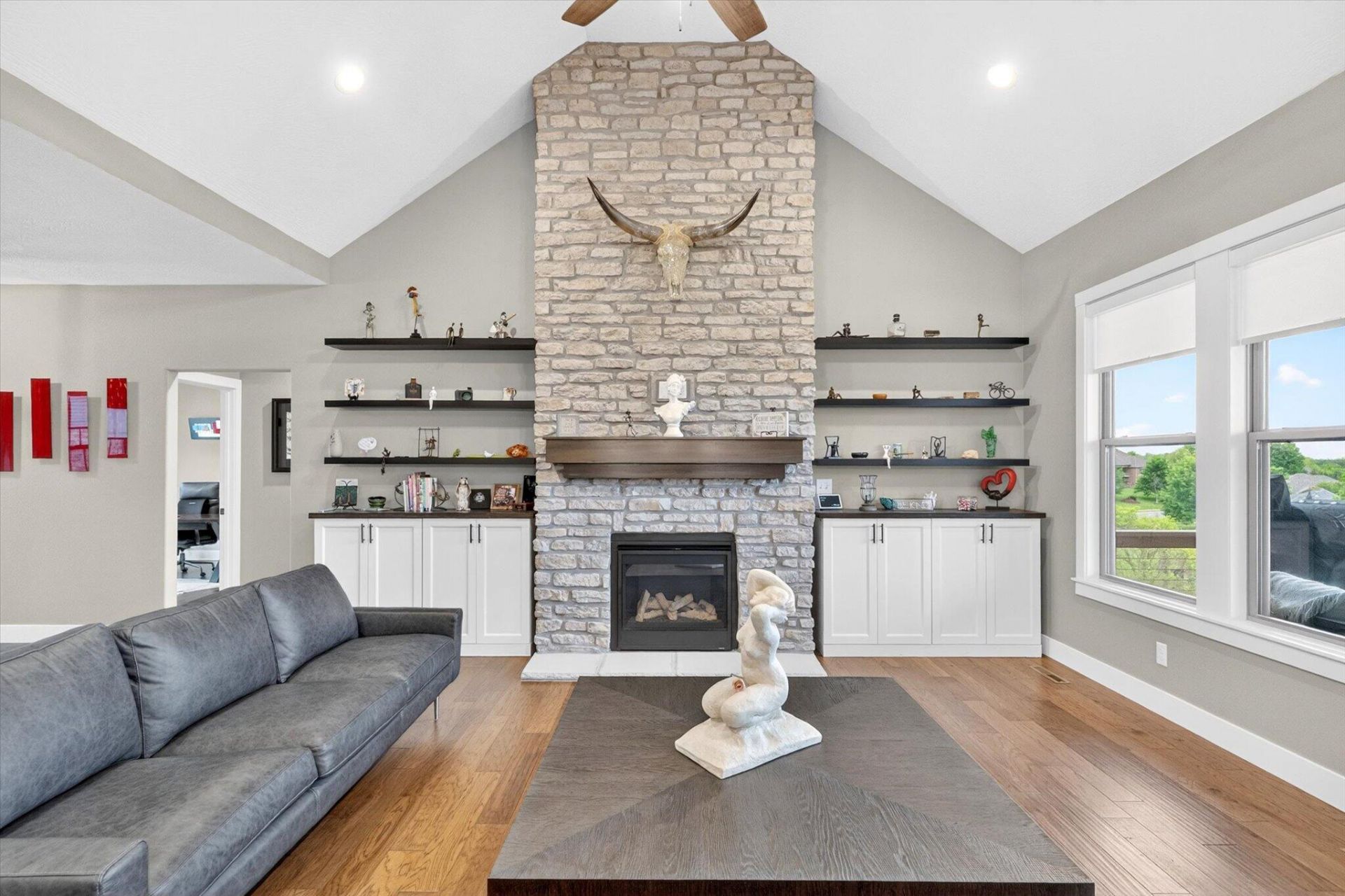 Step into style, space, and sophistication in this Immaculate all- brick, walk-out basement home. Loaded with upgrades and featuring a 3-mile, panoramic view of the James River Valley. Designed for both everyday living and effortless entertaining, this stunning residence features 5 generously sized bedrooms, 3.5 beautiful bathrooms, and multiple living areas--giving everyone room to relax in comfort and privacy.The open-concept main level is a showstopper with soaring cathedral ceilings and walls of windows. The kitchen is centered around an oversized, granite- top island that invites gathering :) Complemented by abundant custom cabinetry, a true walk-in pantry and a seamless flow into the living room. There, a dramatic floor-to-ceiling stone fireplace--flanked by built-in cabinets and floating shelves--creates a warm anchor for the space.Luxury continues throughout with NO carpet, ensuring a clean, modern aesthetic and easy upkeep. The walk-out basement expands your living and entertaining options with a stylish wet bar/ kitchenette, an additional living space as well as an area ready for game tables and pinball machines.Step outside to enjoy both a covered back deck and a covered patio below--ideal for year-round relaxation--overlooking a fully fenced and irrigated yard that keeps everything lush and low-maintenance. The huge John Deere room has an overhead door and the capacity for any number of hobbies or even vehicles. There is an additional space with secondary laundry hook-up as well as an impressive amount of additional room for storage, blending beauty with functionality.Professional landscaping with both mature established plants and trees as well as many newer trees for future enjoyment.Lion's Gate is a Gated community with protective covenants located in Southwest Springfield. Featuring a Swimming pool, tennis courts, basketball court, clubhouse and children's play area.